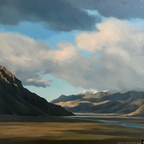 Landscape painting of mountains, river, and cloudy sky with snow-capped peaks in the distance. Tasman Valley, Aoraki, Mount Cook. View fullsize